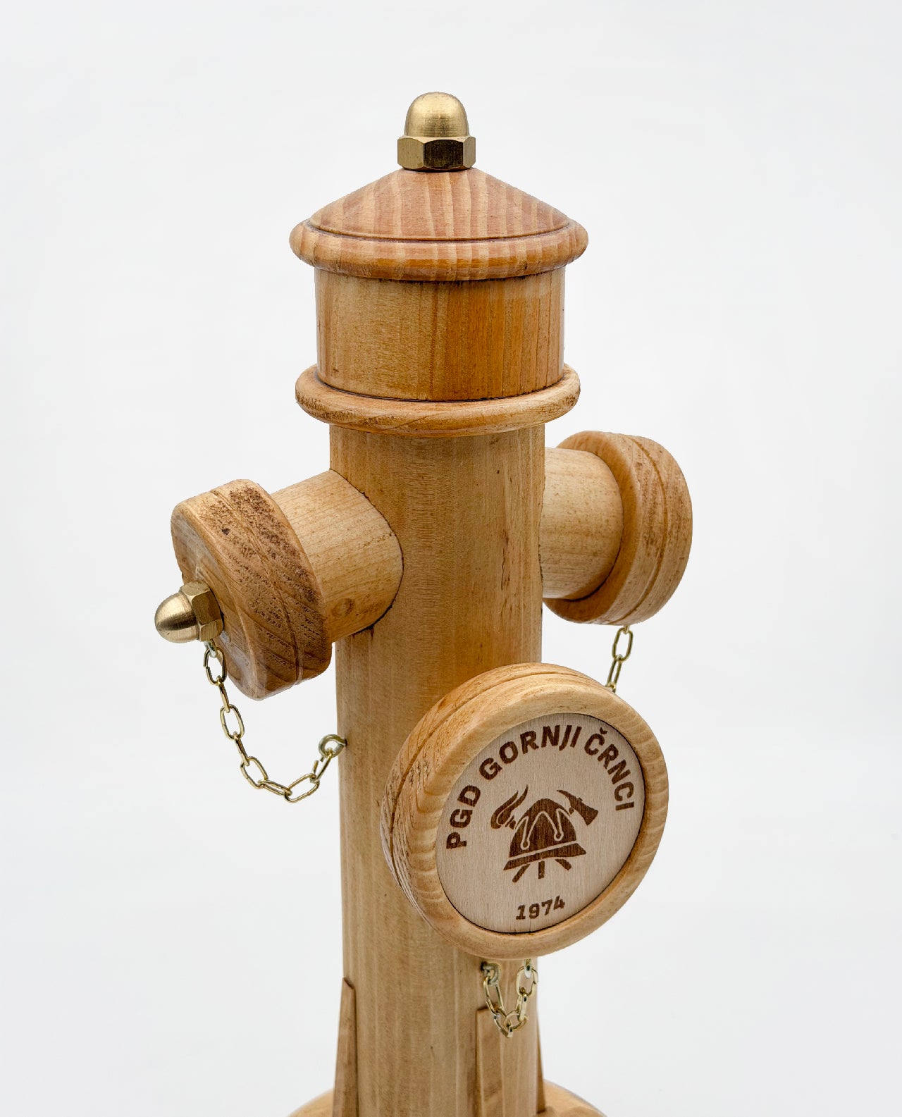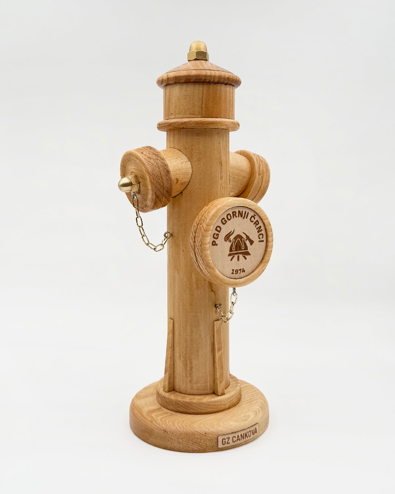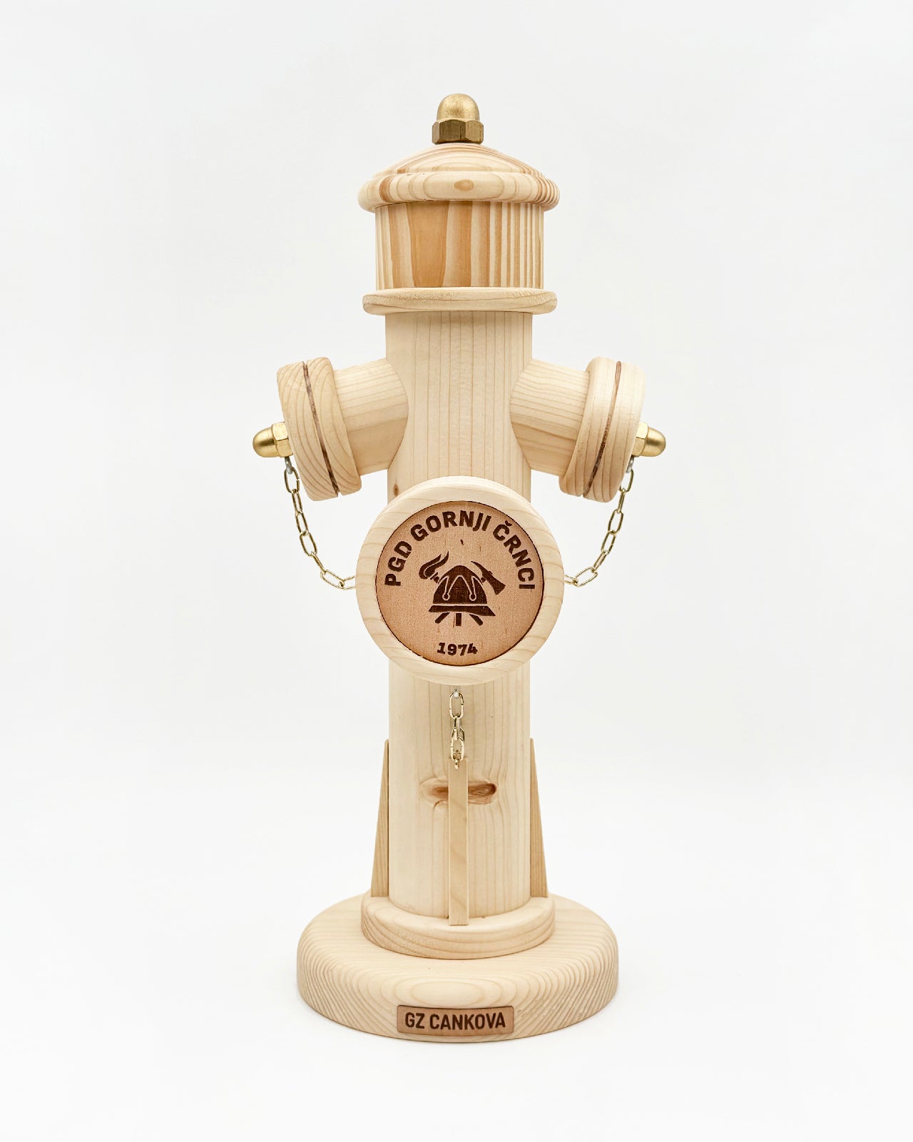 Lesena plaketa v obliki gasilskega hidranta je prepoznaven gasilski simbol, oblikovan kot samostojen spominski kos. Plaketa je ročno izdelana iz lesa, natančno brušena, sestavljena in zaščitena s premazom, ki poudari naravno strukturo ter hkrati ščiti površino.