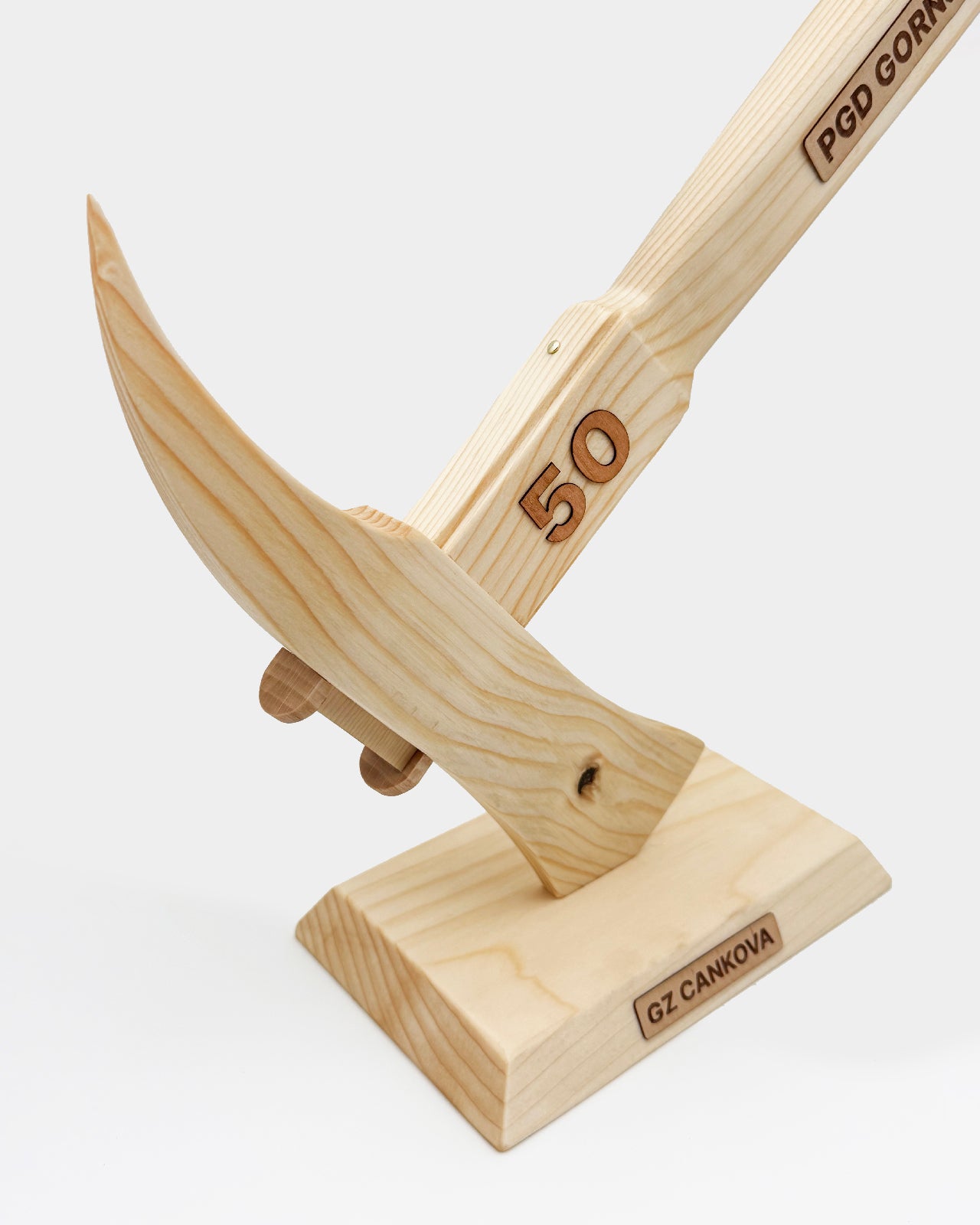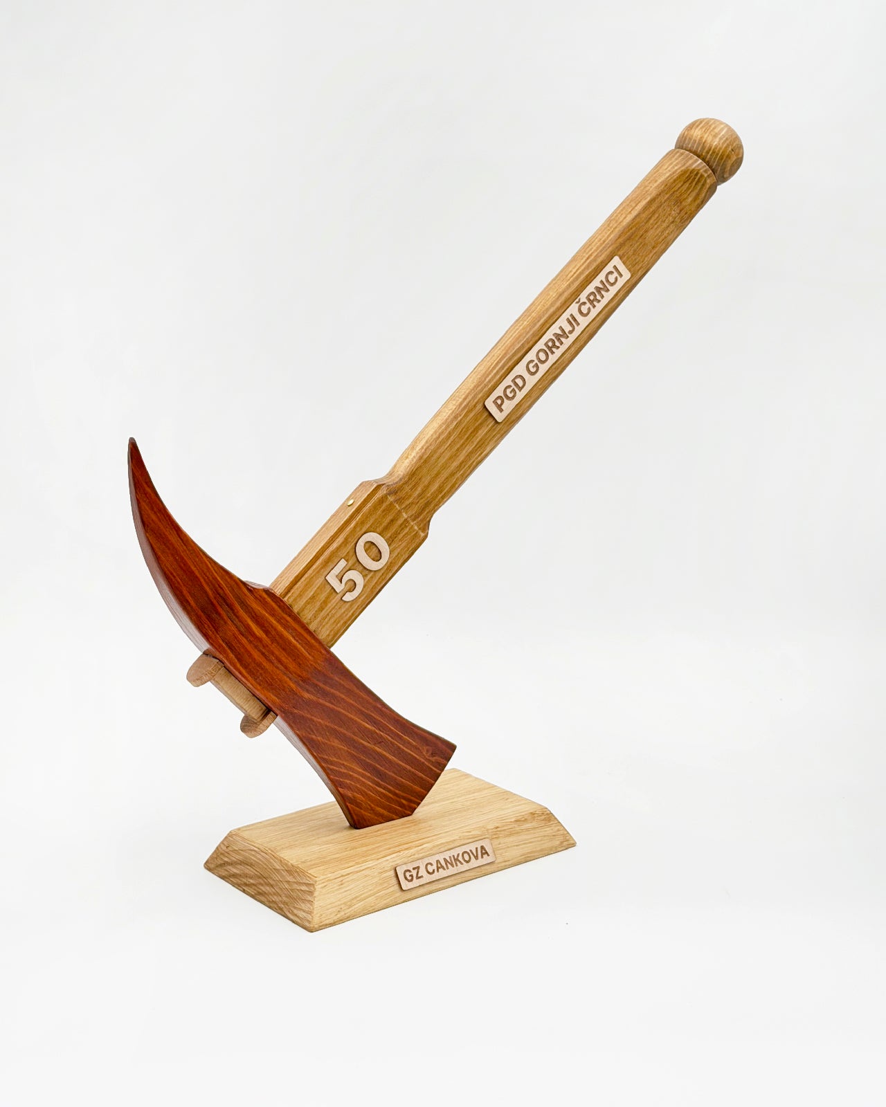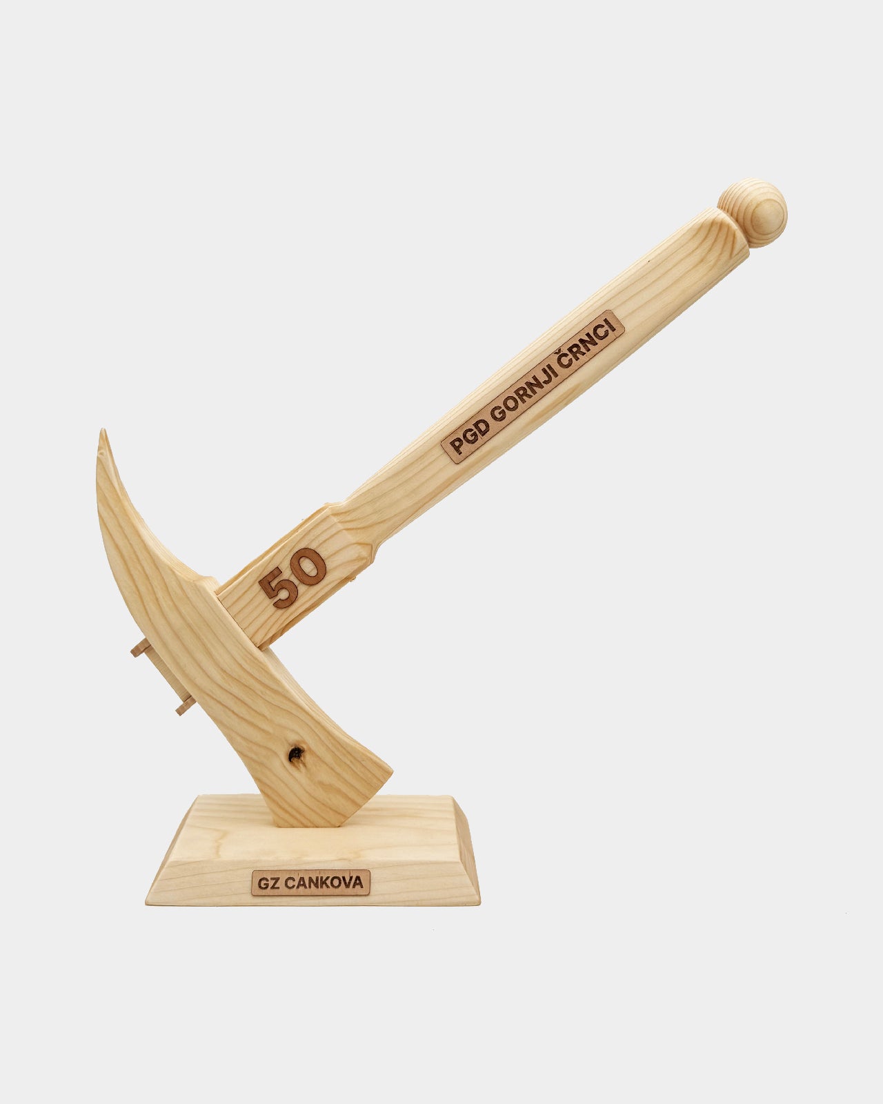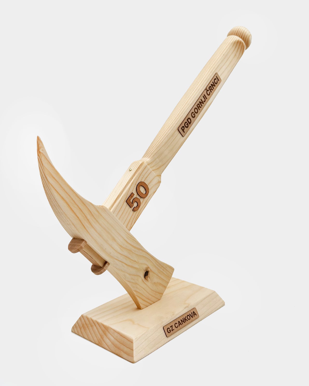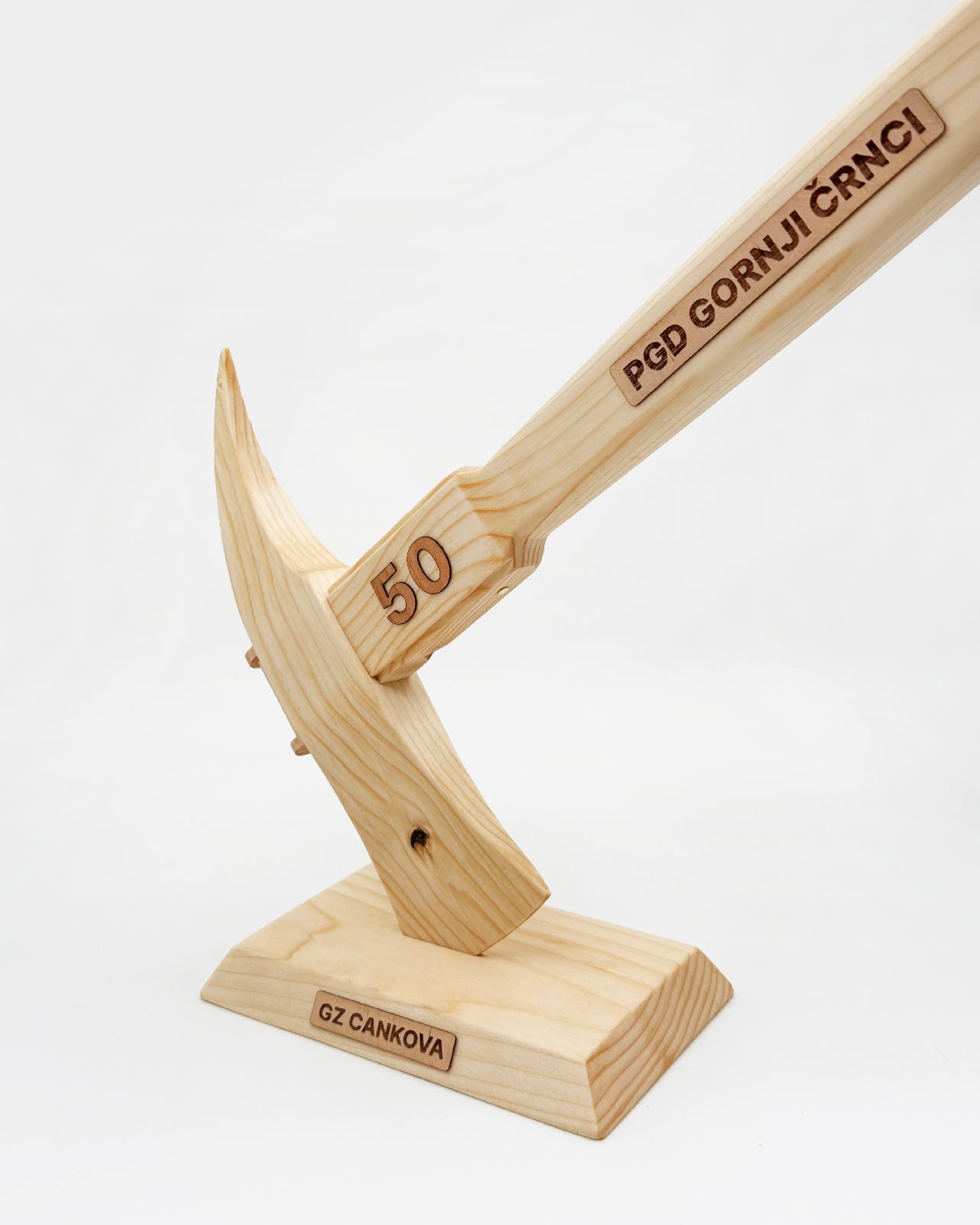 Na ročaju je lahko po želji dodano besedilo ali letnica, izvedena z lasersko gravuro. Na podstavku je možen dodaten kratek napis – ime društva, jubilej ali posvetilo. Vse gravure so opcijske in prilagojene vašemu društvu.